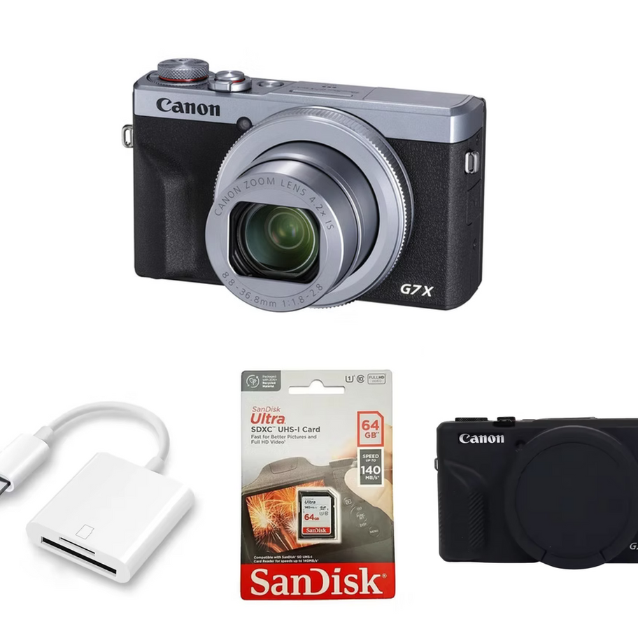 מארז CANON G7X Mark III בכסף עם כרטיס SD 64GB,קורא Lightning וכיסוי סיליקון שחור