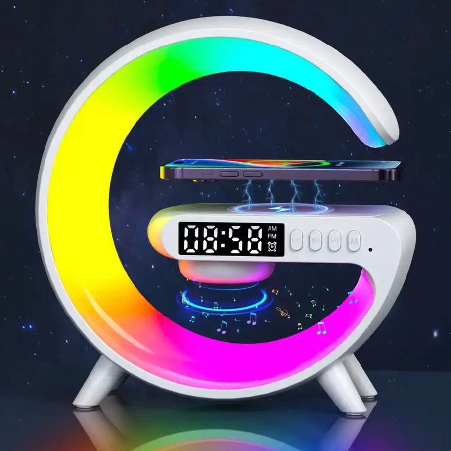 מנורה משולבת מטען אלחוטי 15W, רמקול Bluetooth, ושעון עם תאורת RGB