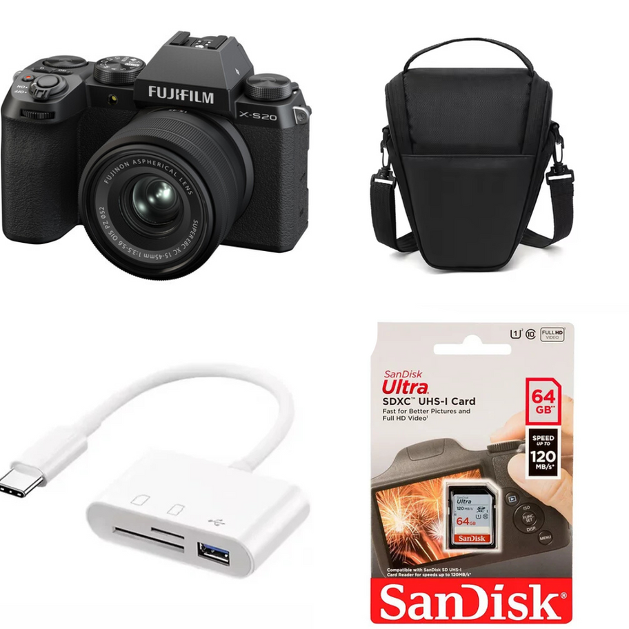 ערכת FUJIFILM X-S20 15-45 עם כרטיס SD 64GB, קורא כרטיס USB-C ותיק צד