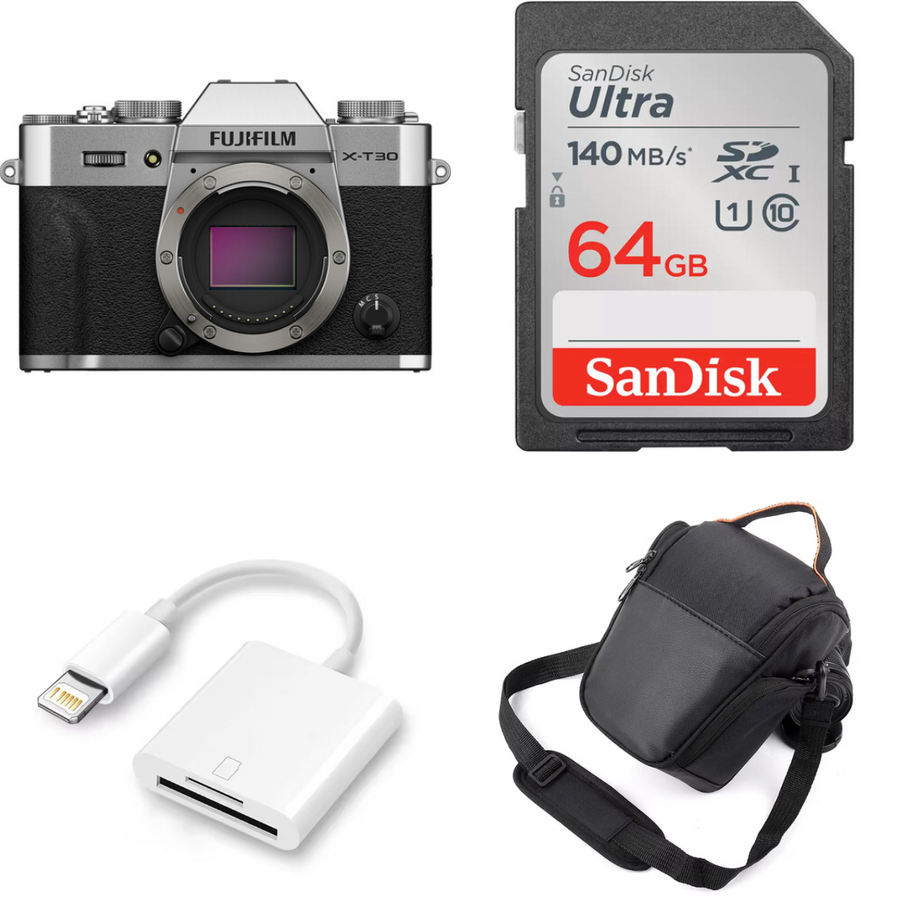 ערכת FUJIFILM X-T30 III גוף כסוף עם כרטיס SD 64GB, קורא כרטיס Lightning ותיק צד