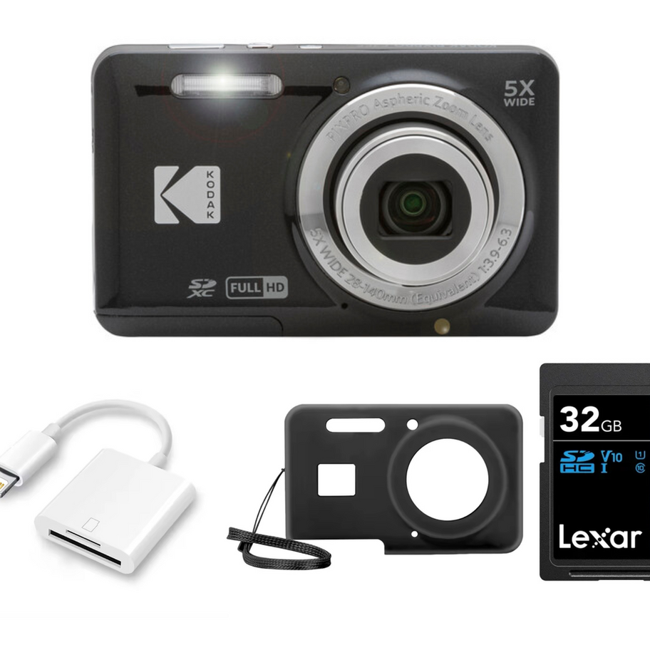 ערכת Kodak PixPro FZ55 בצבע שחור עם כרטיס SD 32GB, קורא Lightning וכיסוי סיליקון