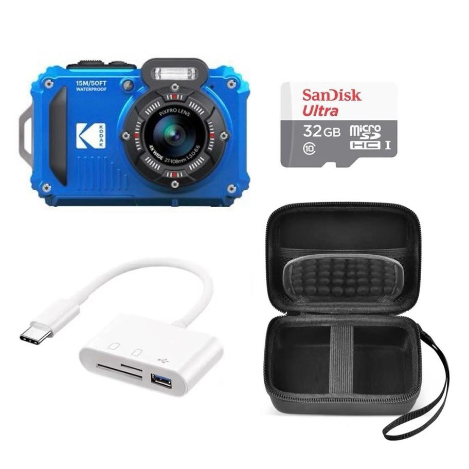 ערכת Kodak PixPro WPZ2 כחול, כרטיס MicroSD 32GB, קורא כרטיס USB-C ותיק קשיח