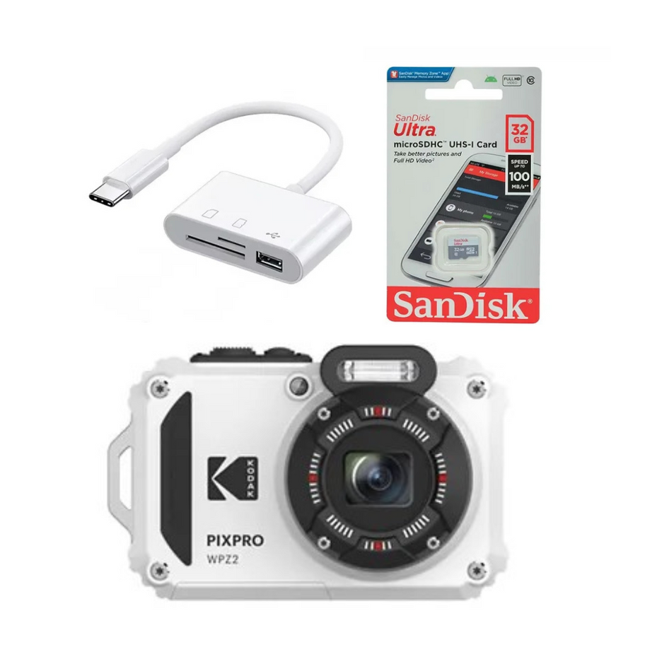 ערכת Kodak PixPro WPZ2 לבן, כרטיס MicroSD 32GB וקורא כרטיס USB-C