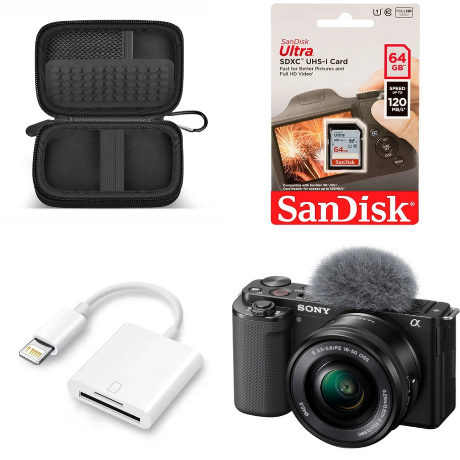 ערכת SONY ZV-E10 16-50 בשחור עם כרטיס SD 64GB, קורא כרטיס Lightning ותיק